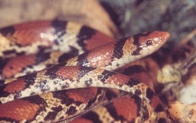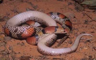 The red nose will identify this snake as a harmless species, as will the fact that the dorsal markings are saddles, not rings, and narrow black markings separate the red from the white. Scarlet snakes feed primarily on eggs of other reptiles.