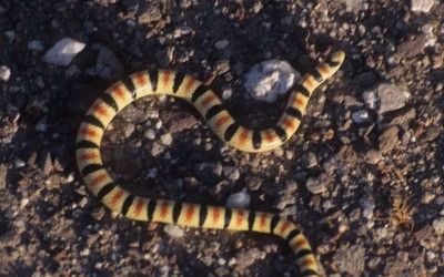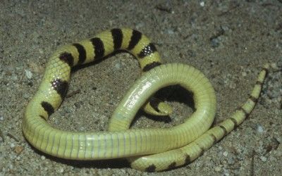 This slender burrowing desert dweller may attain a length of 15” or a bit more. The primary colors are straw-yellow with wide black bands. No secondary banding. Some black bands may be rings crossing the belly, otherwise the belly is white and concave. This is a species of the open desert sands. Use range to assist in identification